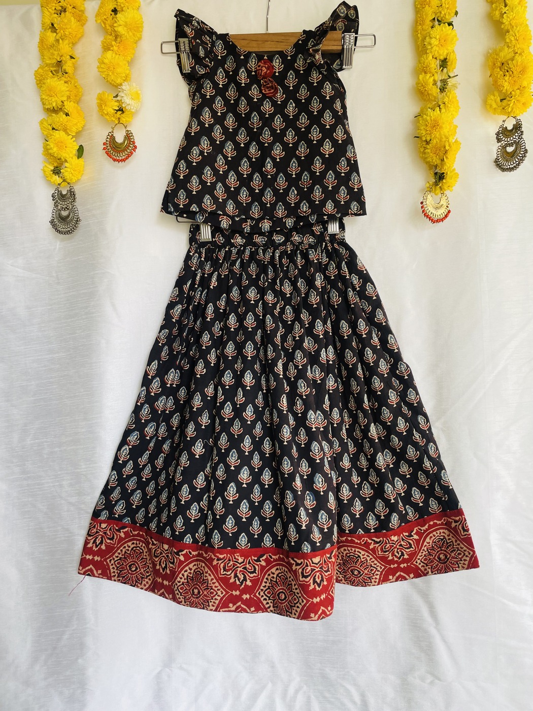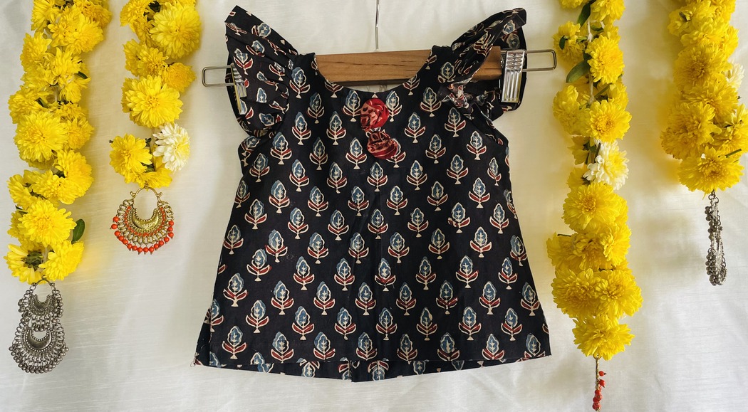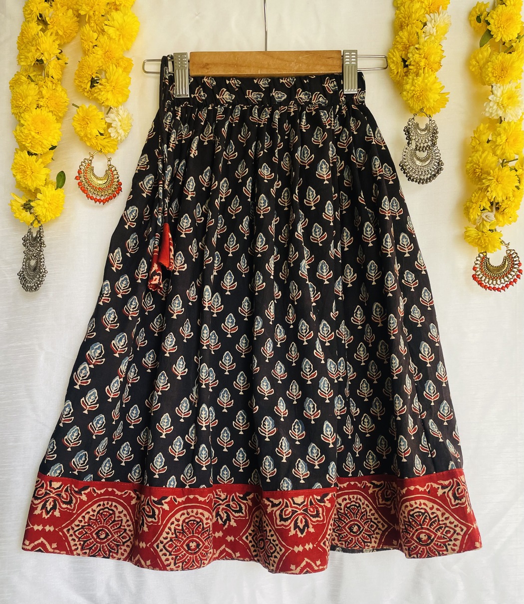 Our latest Ajrakh cotton lehenga choli aka pavadai sattai sets is festive, earthy and instantly beautiful ! Watch your little girl twirl in delightfully vibrant colours, bringing in the festive mood in total comfort.