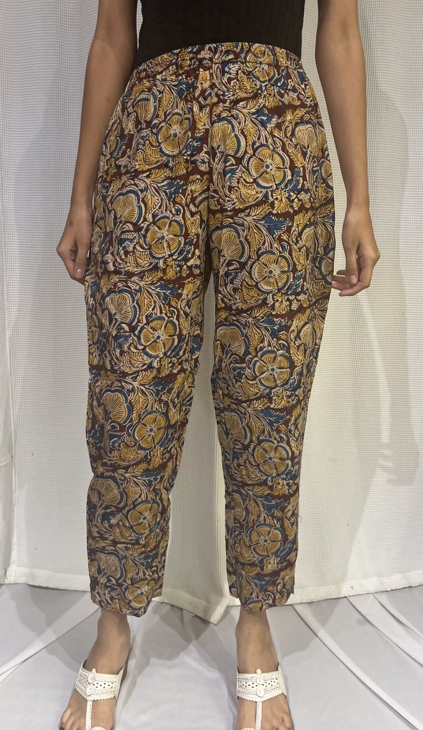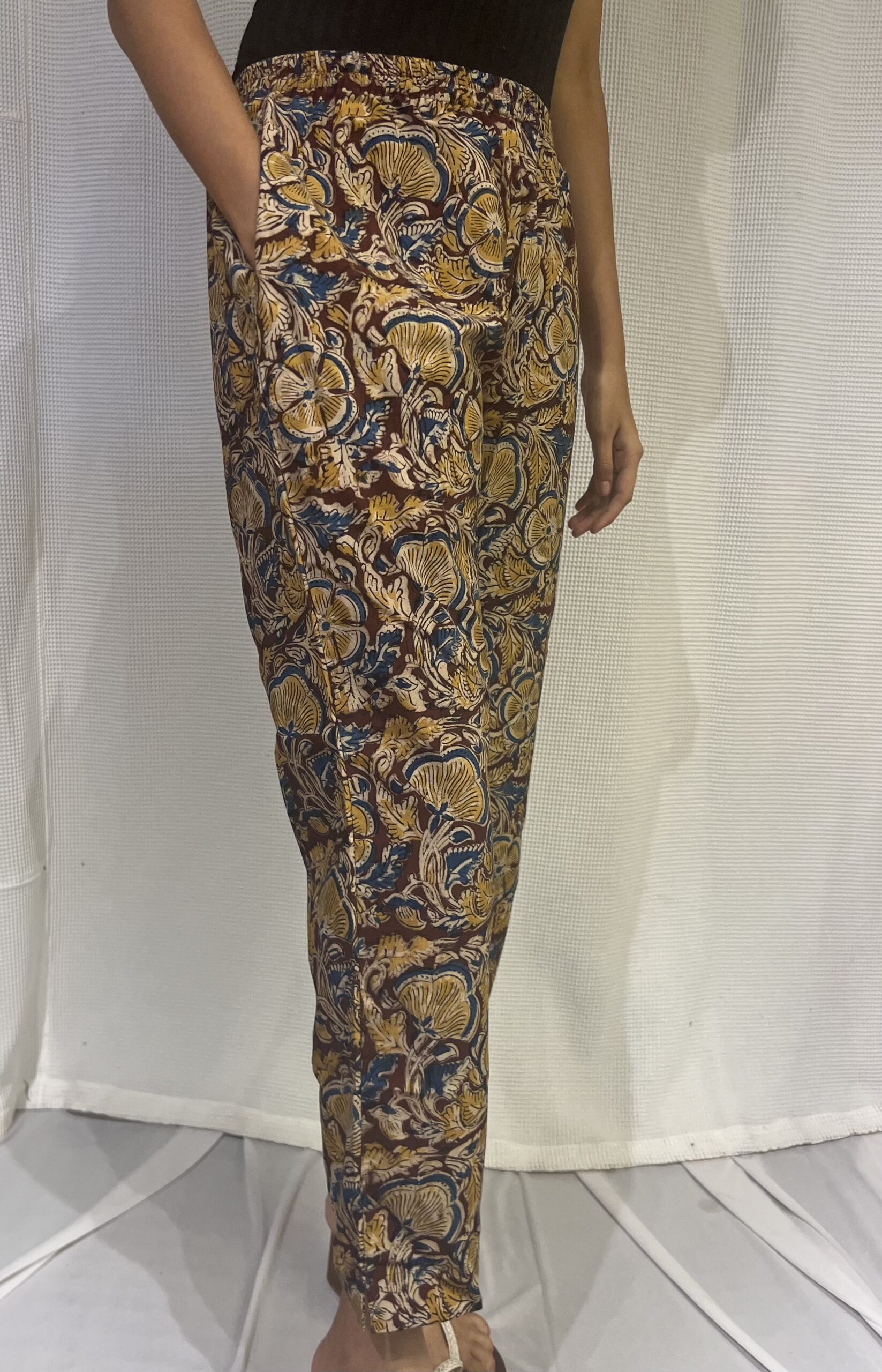 Add a splash of cheer to your wardrobe with these vibrant Kalamkari brown pants. They come with full elastic and pockets, to give you the flexibility to go about your tasks for the day.