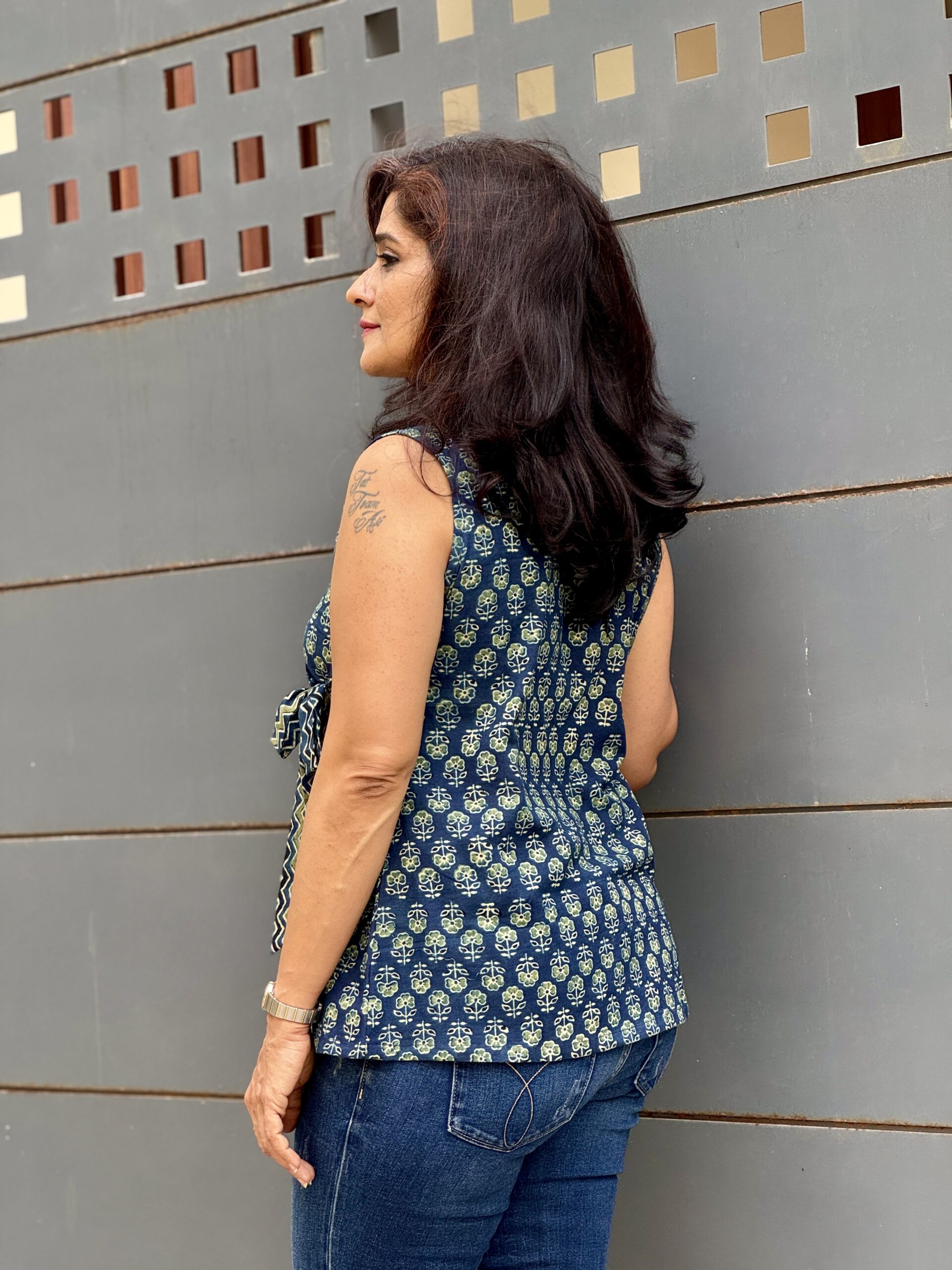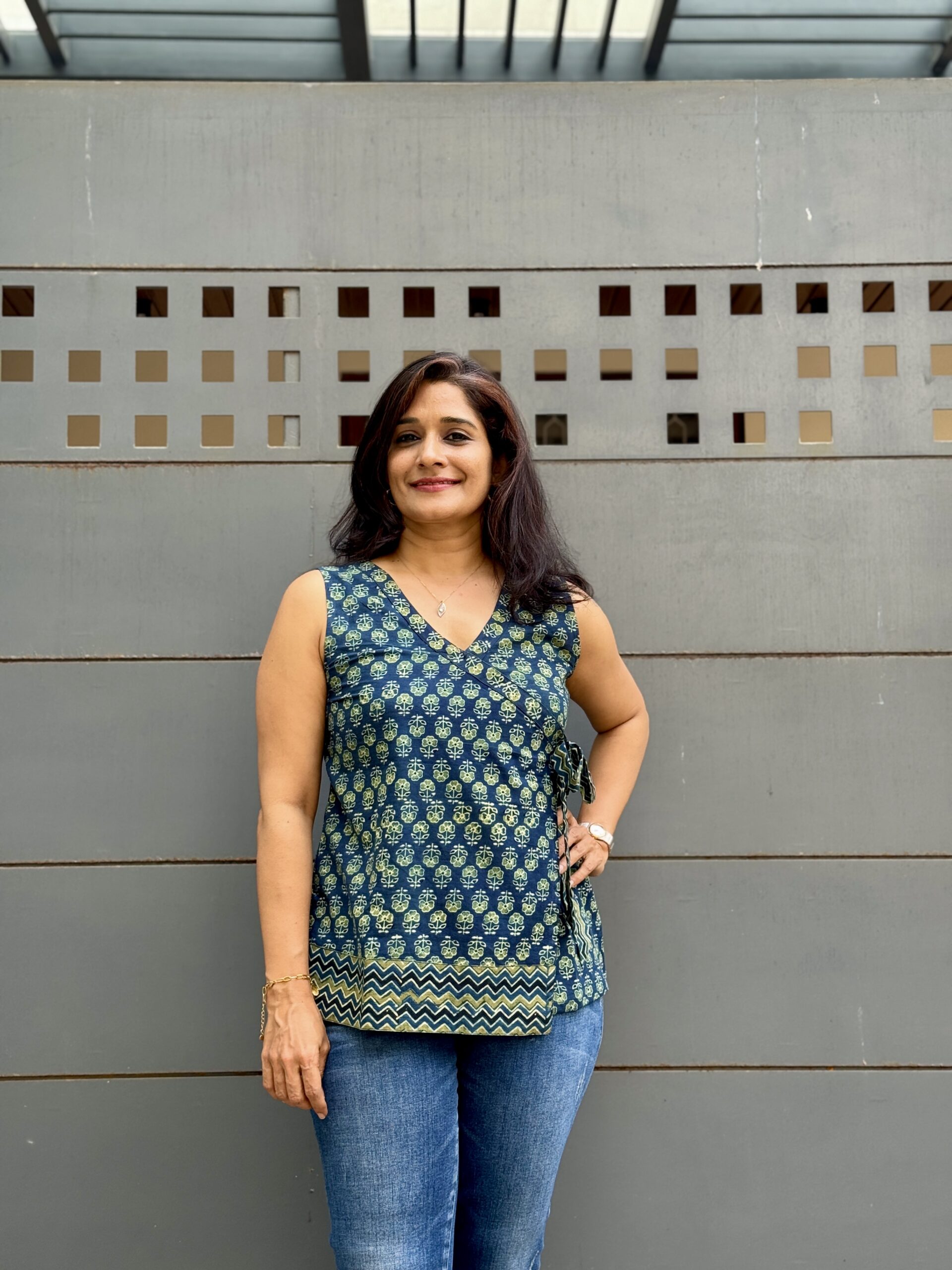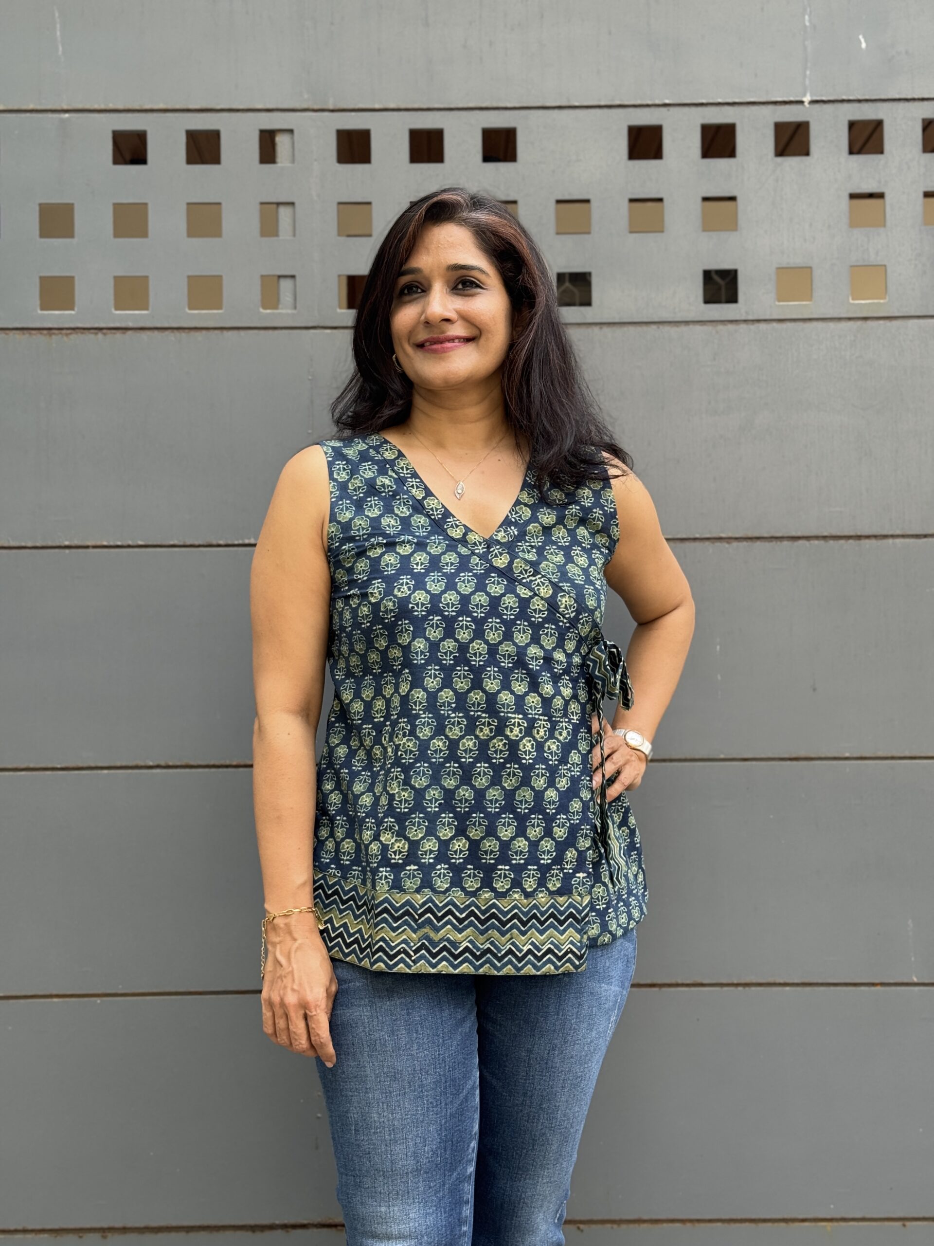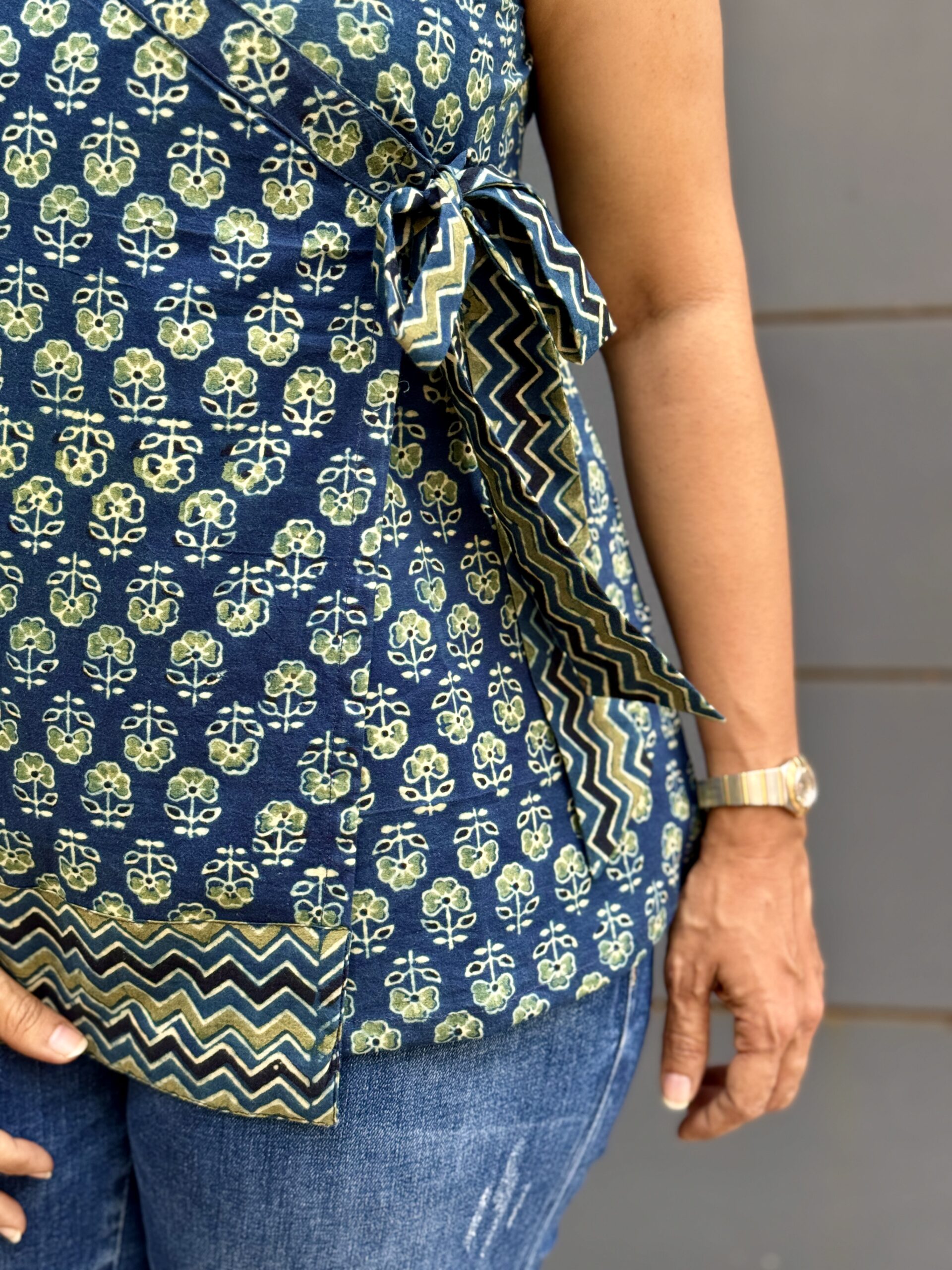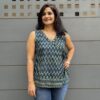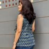 Lagoon Whispers — a bold sleeveless top in premium cotton featuring striking Ajrakh prints with vibrant blue, green, and black zigzag highlights, and a matching zigzag side knot. Comfortable enough for all day, edgy enough to stand out.