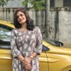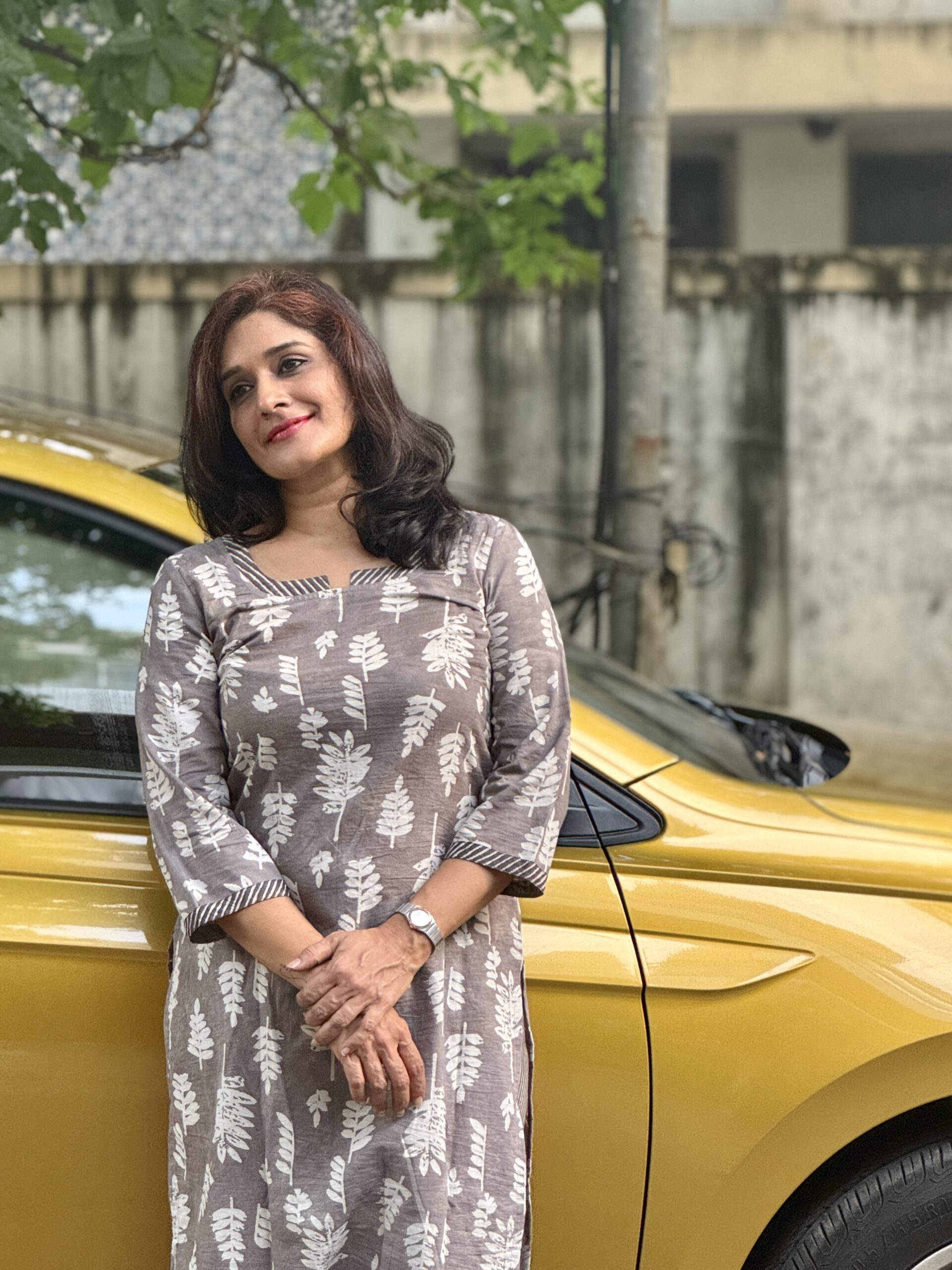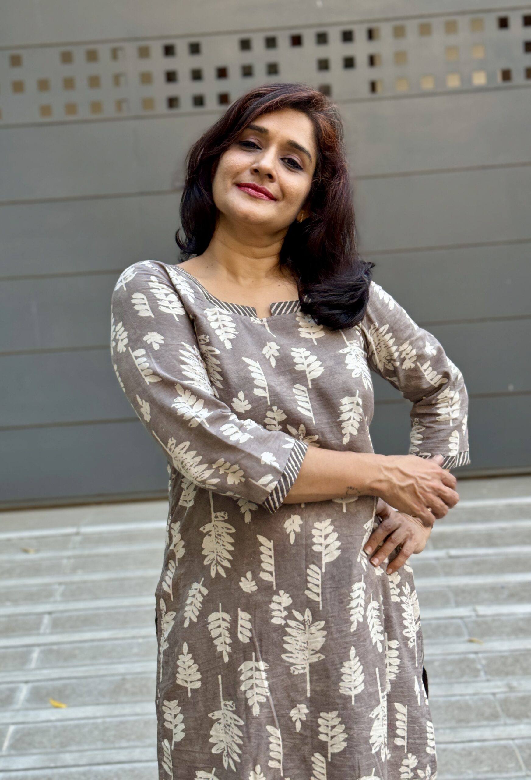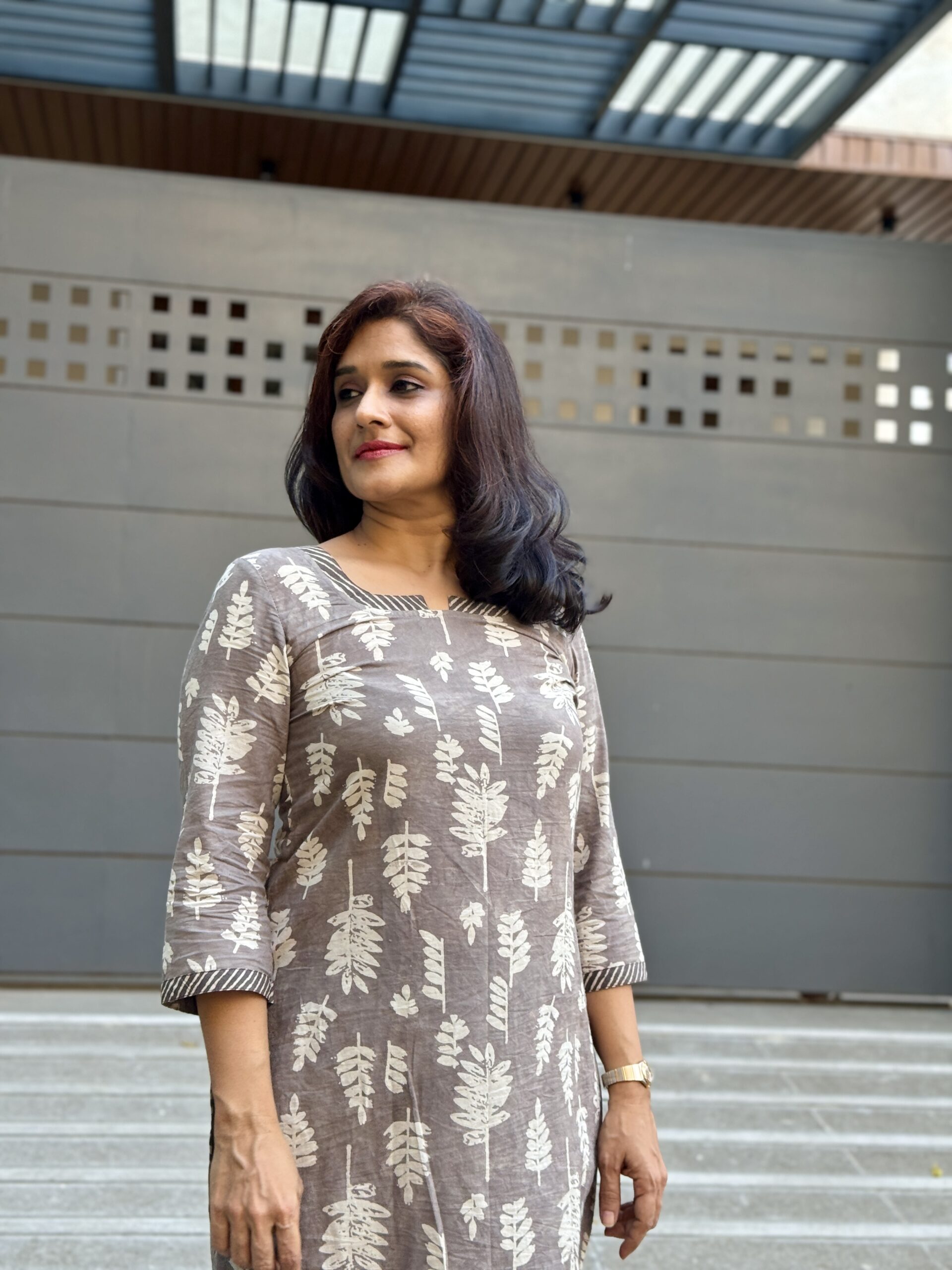 This grey co-ord set with 3/4th sleeves features Dabu hand block leaf prints and is paired with stylish striped pants. Made from soft cotton, it’s perfect for everyday office wear with a touch of elegance.